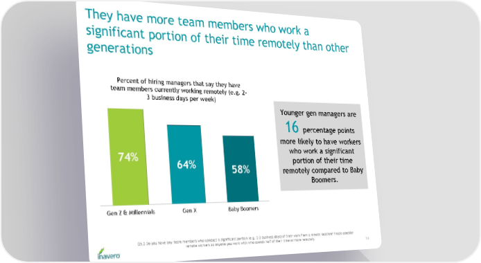 They have more team members who work a significant portion of their time remotely than other generations Younger gen managers are 16 percentage points more likely to have workers who work a significant portion of their time remotely compared to Baby Boomers. Q5.2 Do you have any team members who conduct a significant portion (e.g. 2-3 business days) of their work from a remote location? Please consider remote workers as anyone you work with who spends half of their time or more remotely. 14