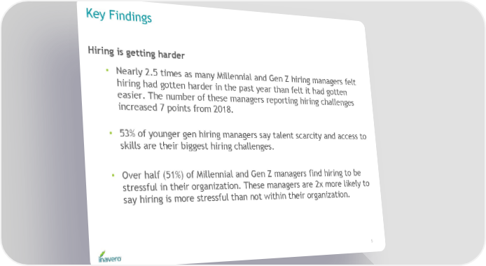 Key Findings Hiring is getting harder • Nearly 2.5 times as many Millennial and Gen Z hiring managers felt hiring had gotten harder in the past year than felt it had gotten easier. The number of these managers reporting hiring challenges increased 7 points from 2018. • 53% of younger gen hiring managers say talent scarcity and access to skills are their biggest hiring challenges. • Over half (51%) of Millennial and Gen Z managers find hiring to be stressful in their organization. These managers are 2x more likely to say hiring is more stressful than not within their organization. 5