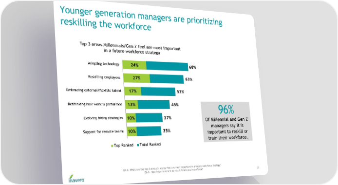 Younger generation managers are prioritizing reskilling the workforce 96% Of Millennial and Gen Z managers say it is important to reskill or train their workforce. Q4.6. What are the top 3 areas that you feel are most important in a future workforce strategy? Q6.2. How important is it to reskill/train your workforce? 20