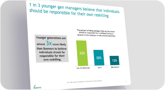1 in 3 younger gen managers believe that individuals should be responsible for their own reskilling Younger generations are almost 3x more likely than Boomers to believe individuals should be responsible for their own reskilling. Q6.4. Who should be responsible for training and reskilling employees? 21