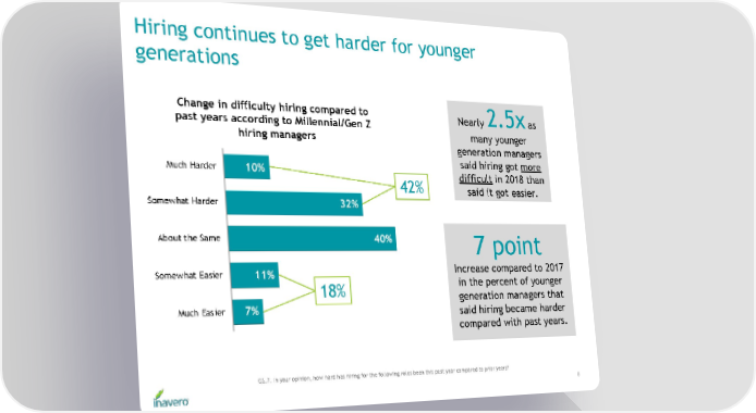Hiring continues to get harder for younger generations Nearly 2.5x as many younger generation managers said hiring got more difficult in 2018 than 42% said it got easier. 7 point Increase compared to 2017 in the percent of younger 18% generation managers that said hiring became harder compared with past years. Q2.7. In your opinion, how hard has hiring for the following roles been this past year compared to prior years? 8