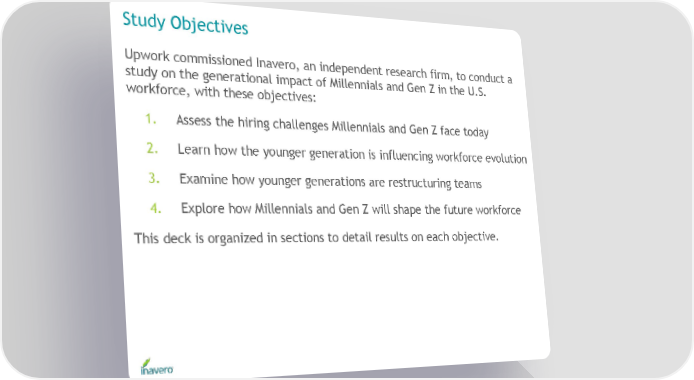 Study Objectives Upwork commissioned Inavero, an independent research firm, to conduct a study on the generational impact of Millennials and Gen Z in the U.S. workforce, with these objectives: 1. Assess the hiring challenges Millennials and Gen Z face today 2. Learn how the younger generation is influencing workforce evolution 3. Examine how younger generations are restructuring teams 4. Explore how Millennials and Gen Z will shape the future workforce This deck is organized in sections to detail results on each objective.