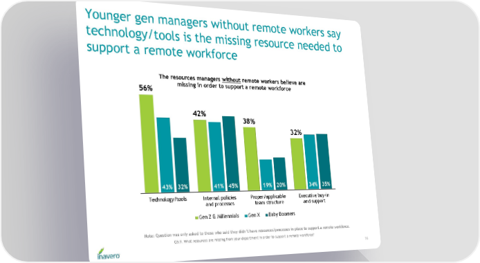 Younger gen managers without remote workers say technology/tools is the missing resource needed to support a remote workforce Note: Question was only asked to those who said they didn’t have resources/processes in place to support a remote workforce. Q5.9. What resources are missing from your department in order to support a remote workforce? 16