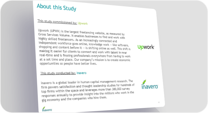 About this Study This study commissioned by: Upwork Upwork (UPWK) is the largest freelancing website, as measured by Gross Services Volume. It enables businesses to find and work with highly skilled freelancers. As an increasingly connected and independent workforce goes online, knowledge work -- like software, shopping and content before it -- is shifting online as well. This shift is making it easier for clients to connect and work with talent in near real-time and is freeing professionals everywhere from having to work at a set time and place. Our company’s mission is to create economic opportunities so people have better lives. This study conducted by: Inavero Inavero is a global leader in human capital management research. The firm powers satisfaction and thought leadership studies for hundreds of top firms within the space and leverages more than 300,000 survey responses annually to provide insight into the millions who work in the gig economy and the companies who hire them. 42